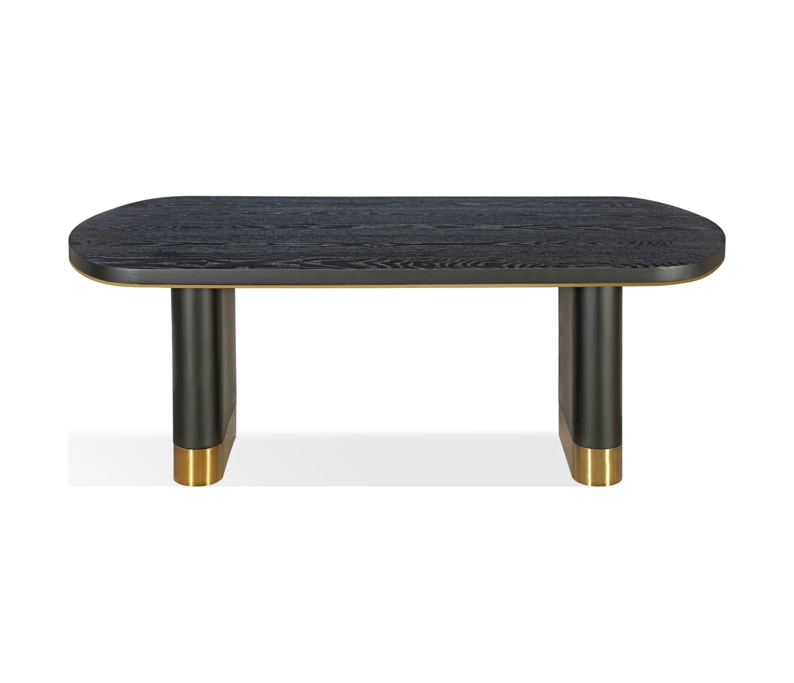 Our Doheny Dining Table, makes a bold statement in any dining space. The racetrack-shaped top showcases open-grain ash veneer, paired with a striking double-pedestal base in brushed golden stainless steel. Designed with inspiration from art deco and mid-century modern styles, it’s a modern centerpiece that combines elegance, sophistication, and lasting craftsmanship.